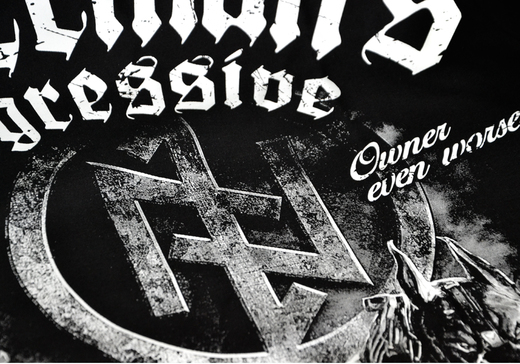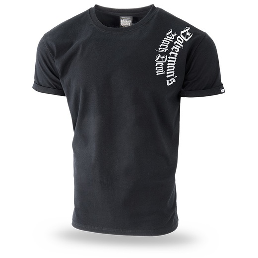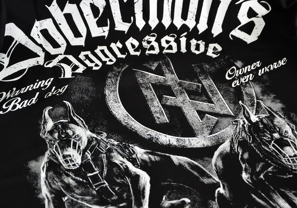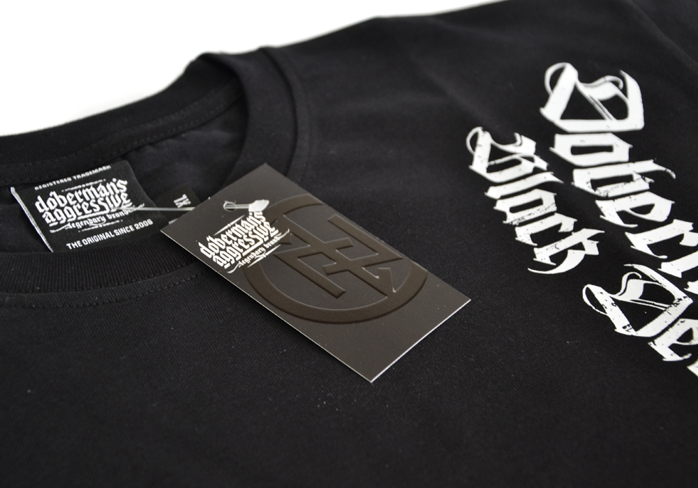 Prosta koszulka w standardowym fasonie wykonana z wysokiej jakości bawełny o masie 200g. Przy szyi wykończona wąskim ściągaczem. Na lewym rękawku znajduje się mała metka z logo Dobermans Aggressive. Niemal cały tył koszulki zajmuje grafika przedstawiająca dwa dobermany. Za psami znajduje się symbol runiczny. Wyżej duży napis przechodzący przez szwy rękawków. Na lewym barku napis Dobermans Black Devil drukowany w pionie.
