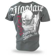 Wykonana z wysokiej jakości materiału koszulka męska o prostym fasonie. Wykorzystano wytrzymałą bawełnę o masie 200g. Koszulka przy szyi została wykończona wąskim ściągaczem co podnosi komfort użytkowania. Na lewej piersi niewielki napis Valhalla oraz runiczny symbol. Plecy w znaczącym stopniu pokrywa nadruk. Grafika przedstawia majestatycznego wojownika na piedestale. Pochyla się on i opiera na mieczu. Za nim widnieje flota wikingów. Powyżej znajduje się duży napis Valhalla oraz symbole runiczne. Wzór nawiązujący do linii Vikings.