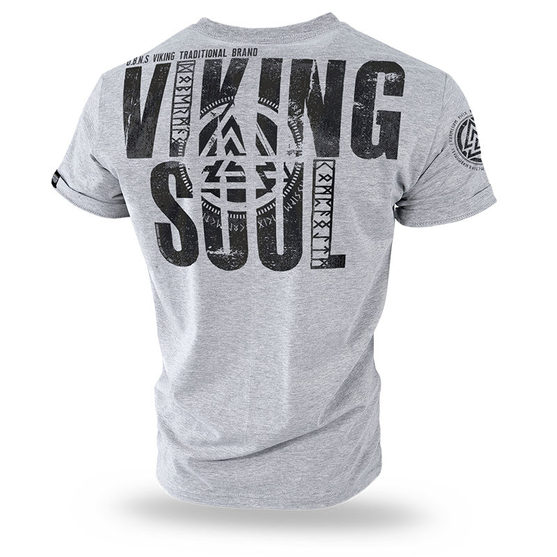 Klasyczny fason T-shirtu. Posiada krótki rękawek oraz wąski ściągacz przy szyi poprawiający komfort noszenia. Na lewym rękawku mała metka z logo Dobermans Aggressive. Koszulkę wykonano z wysokojakościowej bawełny. Ozdobiona nadrukami w różnych miejscach. Na plecach duży nadruk z napisem Viking Soul. W napis zostały włożone symbole nawiązujące do mitologii nordyckiej. Na prawym rękawku symbole runiczne wpisane w koło. Lewa pierś została ozdobiona nadrukiem z nazwą modelu. Zastosowano efekt podniszczenia nadruku.