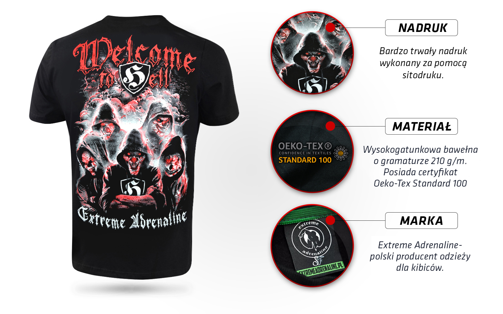 Kibicowska koszulka wykonana przez polskiego producenta odzieży dla kibiców - Extreme Adrenaline. Podczas projektowania oraz wykonania koszulki zadbano o jej najdrobniejsze detale. Nadruk na koszulce wykonany został przy pomocy sitodruku. Jest bardzo trwały i nie ulega zniszczeniu podczas użytkowania. Produkt należy prać w temperaturze nie przekraczającej 40 stopni, pozwoli to zdecydowanie dłużej zachować trałość nadruku.