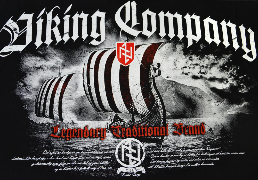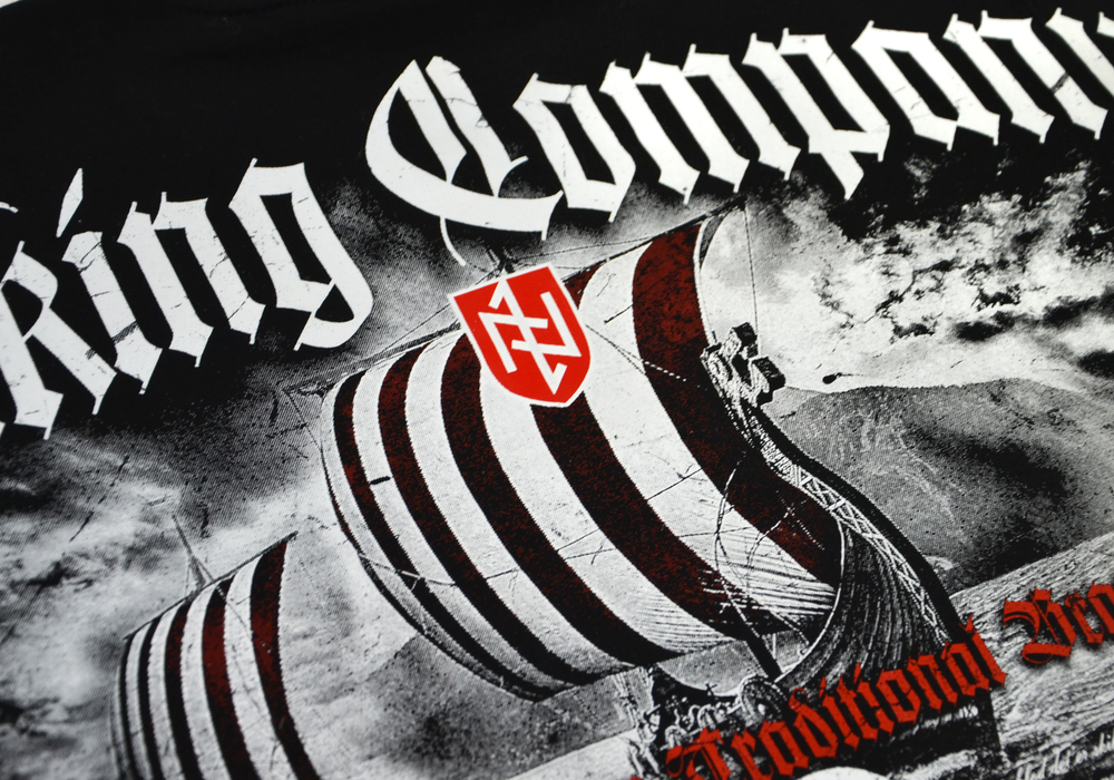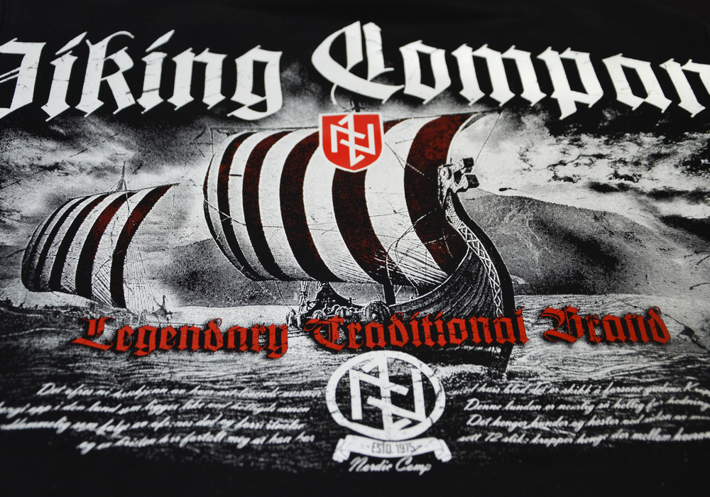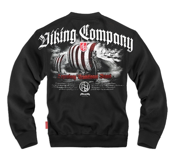 Bawełniana bluza męska o prostym kroju. Model wykończony szerokimi ściągaczami. Przy szyi wewnętrzna lamówka w kolorze czerwonym, na boku wszywka z logo marki. Tkanina o masie 320g. Z tyłu duża, barwna grafika w stylu skandynawskim. Nadruk z flotą drakkarów i symbolami runicznymi. Na żaglu kolorowa haftowana naszywka w formie tarczy. Wysoko na plecach napis Nordic Company przechodzący przez szwy rękawów. Lewa pierś zdobiona znakiem tarczy haftowanym bezpośrednio na materiale.