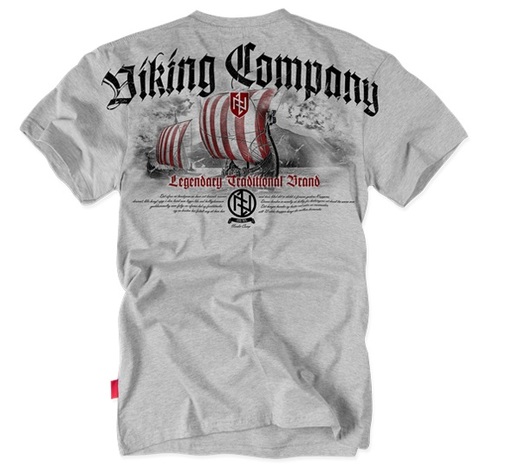 Koszulka męska z krótkim rękawem wykonana z wysokogatunkowej bawełny. Koszulka w standardowym fasonie, materiał to 100% bawełny o gramaturze 200 g. Na lewej piersi wyhaftowany znak tarczy z symbolami runicznymi. Na plecach koszulki duży napis Viking Company oraz grafika przedstawiająca okręty wikingów.