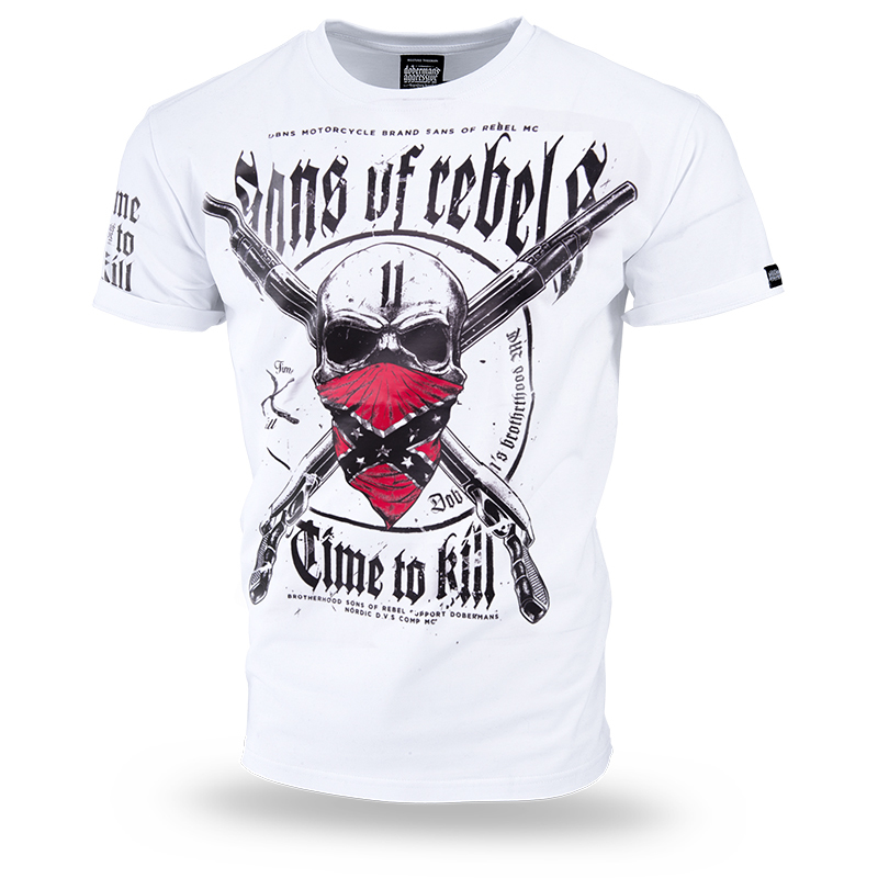 Męska koszulka o klasycznym kroju, wykończona ściągaczem i metkami Doberman’s Aggresive, została częścią kolekcji SONS OF REBEL z oryginalną grafiką umieszczoną na przodzie koszulki, która przedstawia hasła Sons of Rebel i Time to Kill, pomiędzy nimi czaszka w konfederatce a za nią dwa shootgun’y. Wszystkie napisy na koszulce zostały wykonane w gotyckim stylu, również te umieszczone na rękawie: Time to Kill i Doberman’s Aggresive.