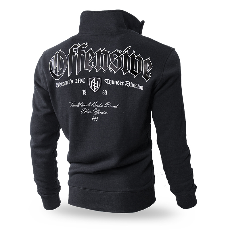 Męska klasyczna bluza na zamek z wysokiej jakości bawełny, ze stójką i ściągaczami, to nasza następna propozycja z kolekcji Offensive. Na piersi wyhaftowane trzy pioruny, a na plecach grafika w gotycko-motocyklowym stylu. Główną rolę gra napis Offensive, tuż pod nim Doberman’s Motorcycle Club Thunder Division, pomiędzy którym naszyliśmy tarczę zaczerpniętą z tradycji nordyckiej . Dodatkowe hasła i metka z naszym logo dopełniają grafikę i tworzą spójną oryginalną całość.
