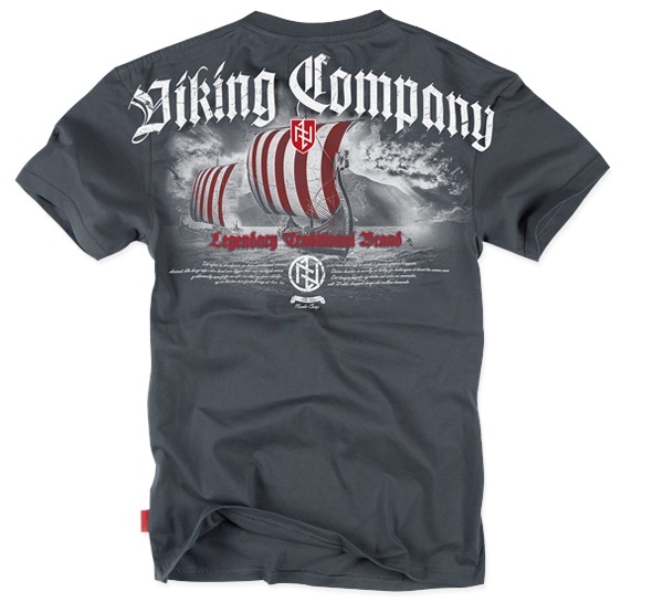 Koszulka męska z krótkim rękawem wykonana z wysokogatunkowej bawełny. Koszulka w standardowym fasonie, materiał to 100% bawełny o gramaturze 200 g. Na lewej piersi wyhaftowany znak tarczy z symbolami runicznymi. Na plecach koszulki duży napis Viking Company oraz grafika przedstawiająca okręty wikingów.