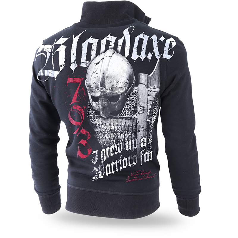 Męska bluza z motywami typowymi dla kolekcji Vikings. Na plecach dwubarwny wzór z efektem spękania, zajmujący niemal całą powierzchnię produktu. Pośrodku grafika przedstawiająca hełm i topór wikinga, obok data 793 w kontrastowym kolorze, poniżej slogan "I grew Up A Warriors Fan". Między łopatkami duży napis Bloodaxe. Data i slogan powielone na froncie bluzy w zmniejszonej skali. Wykorzystano czcionkę w stylu gotyckim. Bluza zapinana wysoko pod szyję, wykończona ściagaczami, wzdłuż karku wzmocniona wewnętrzną lamówką. Model wykonany z dzianiny bawełnianej o masie 320g. Na froncie dwie naszywane kieszenie.