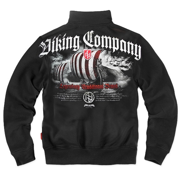 Bawełniana bluza męska o prostym kroju. Model zapinany wysoko pod szyję i wykończony szerokimi ściągaczami. Posiada dwie kieszenie. W środku czerwona lamówka i duża kolorowa metka. Tył bluzy zdobiony dużą barwną grafiką w stylu skandynawskim. Nadruk z flotą drakkarów i symbolami runicznymi. Na żaglu kolorowa haftowana naszywka w formie tarczy. Wysoko na plecach napis Nordic Company przechodzący przez szwy rękawów. Lewa pierś zdobiona znakiem tarczy haftowanym bezpośrednio na materiale.