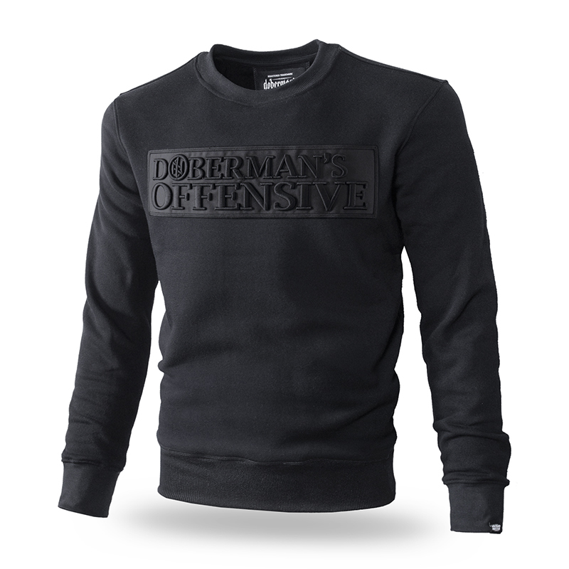 Bawełniana bluza classic zakładana przez głowę. Dół bluzy oraz rękawów wykończono szerokim ściągaczem. Odzież wykonana z wysokiej jakości bawełny o masie 320g. Wewnątrz bluzy duża metka, na lewym rękawie mniejsza z logo marki Dobermans Aggressive. Bluza pochodzi z linii Offensive Premium. Ubrania pochodzące z tej kolekcji charakteryzują się klasycznymi wzorami, ponadczasowymi fasonami i jakością premium. Bluza ma na piersi czarną naszywkę z haftem 3D „Doberman’s Offensive”. Na karku mała naszywka w kształcie koła z haftem 3D.