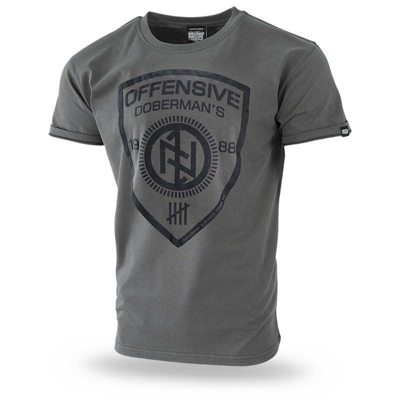 Koszulka męska z krótkim rękawem w klasycznym fasonie. Odzież wykonana z bawełny o gramaturze 200g. Na lewym rękawku mała metka z logo Dobermans Aggressive. Na przodzie znajduje się duży charakterystyczny nadruk w postaci tarczy z kołem, znakami runicznymi i napisem Doberman’s Offensive. Nadruk wykonany metodą, umożliwiającą uzyskanie wypukłej grafiki. Dzięki temu koszulka wygląda bardzo efektownie.