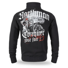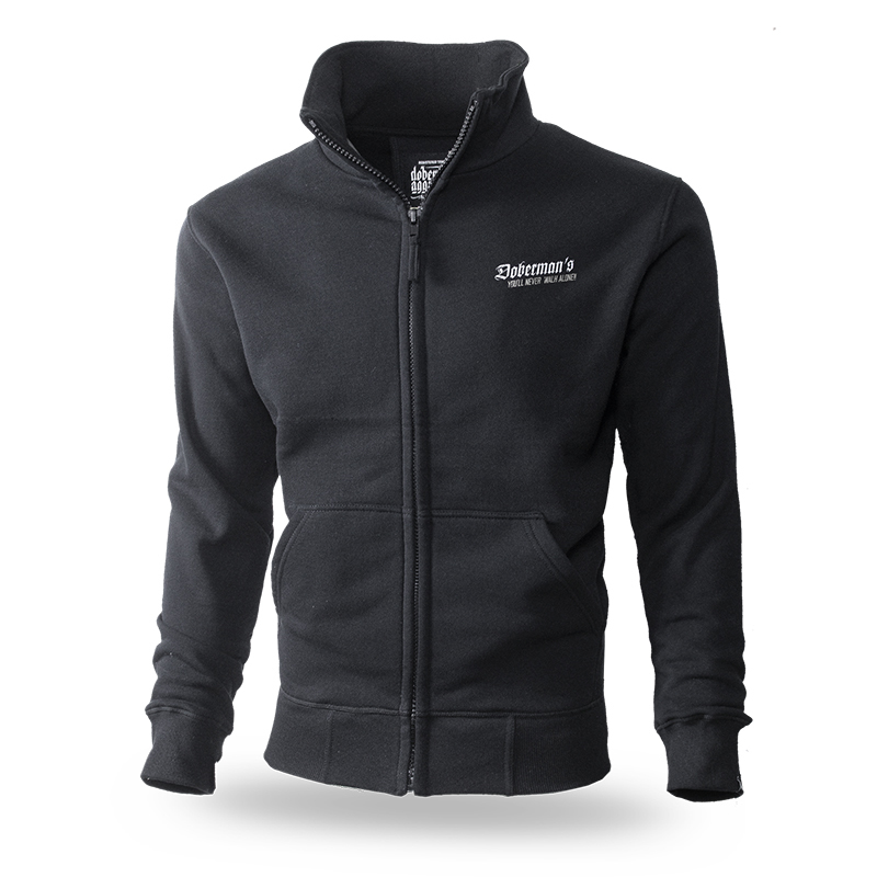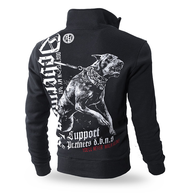 Bluza męska na zamek. Posiada dwie kieszenie naszyte na przodzie. Podwyższony kołnierz doskonale chroni szyję. Dół bluzy i rękawów wykończono szerokim, wytrzymałym ściągaczem. Odzież wykonana z bawełny o wysokiej gramaturze (320). Na lewym rękawie naszyta mała metka z logo marki. Lewą pierś zdobi niewielki napis Dobermans. Na plecach duży nadruk z postacią agresywnego psa trzymanego na smyczy. Poniżej napis Support Partnes, a obok Dobermans. Na całą grafikę zastosowano efekt podniszczenia.