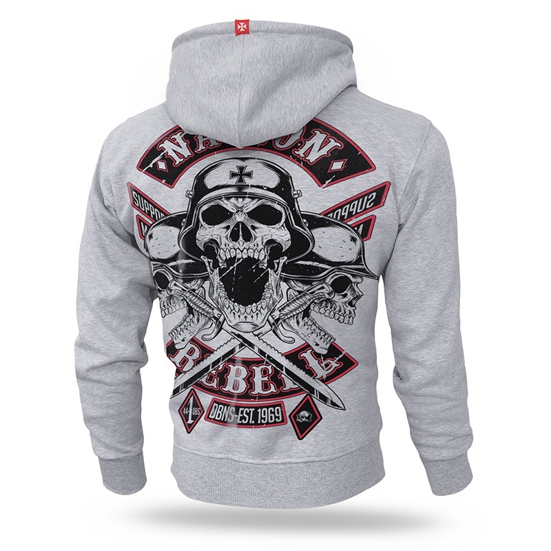 Zapinana wysoko pod szyję męska bluza z kapturem. Przy kapturze sznurki i metalowe okucia, na froncie naszyte dwie praktyczne kieszenie. Dół i rękawy wykończone wytrzymałymi ściągaczami. Model wyprodukowany z bawełny o masie 320g. Bluza z dwubarwnym nadrukiem zajmującym niemal całą powierzchnię pleców, przedstawiającym trzy czaszki w wojskowych hełmach oraz skrzyżowane sztylety. Dodano duży baner z napisem Nation Rebell oraz dwie karty. Na froncie logotyp z symbolem 44 oraz inicjałem DBNS.