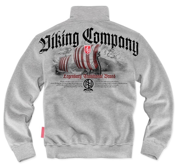 Bawełniana bluza męska o prostym kroju. Model zapinany wysoko pod szyję i wykończony szerokimi ściągaczami. Posiada dwie kieszenie. W środku czerwona lamówka i duża kolorowa metka. Tył bluzy zdobiony dużą barwną grafiką w stylu skandynawskim. Nadruk z flotą drakkarów i symbolami runicznymi. Na żaglu kolorowa haftowana naszywka w formie tarczy. Wysoko na plecach napis Nordic Company przechodzący przez szwy rękawów. Lewa pierś zdobiona znakiem tarczy haftowanym bezpośrednio na materiale.
