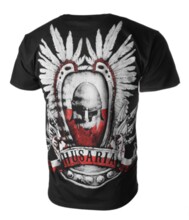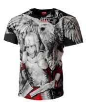 Męska koszulka z nadrukiem. Wykonana z wysokojakościowej bawełny o masie 200g. Klasyczny fason z krótkim rękawem i plisą wewnątrz. Na rękawku mała metka z logo marki. Nadruk pokrywa niemal całe plecy koszulki. W centrum znajduje się wściekły pies przygotowany do ataku. Z boku napis Dobermans oraz dodatkowe hasła wykonane gotyckim fontem. Na lewej piersi mały napis.