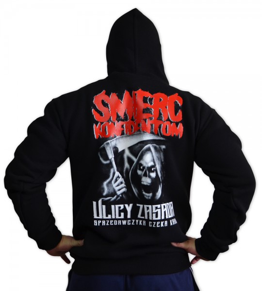 Bluza wykonana przez polskiego producenta odzieży dla kibiców - Extreme Adrenaline. Podczas projektowania oraz wykonania produktu zadbano o najdrobniejsze detale. Nadruk na kbluzie wykonany został przy pomocy sitodruku. Jest bardzo trwały i nie ulega zniszczeniu podczas użytkowania. Produkt należy prać w temperaturze nie przekraczającej 40 stopni, pozwoli to zdecydowanie dłużej zachować trałość nadruku. Rękawy oraz dół bluzy zakończone zostały ściągaczami koloru czarnego.