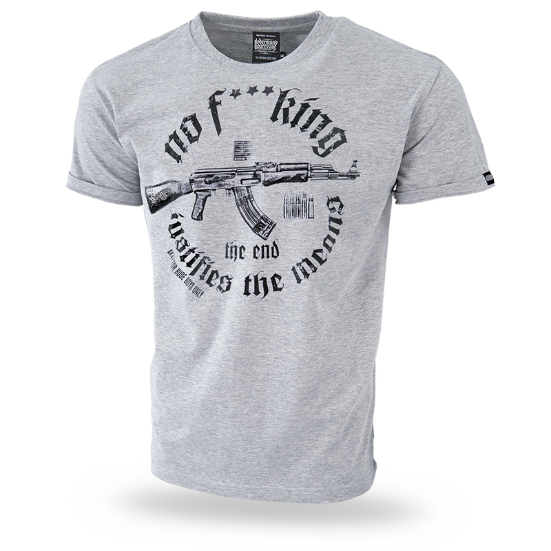 Klasyczny fason T-shirtu z krótkim rękawkiem. Koszulkę wykonano z wysokojakościowej bawełny. Na lewym rękawku mała metka z logo Dobermans Aggressive. Na piersi umieściliśmy duży nadruk w kształcie koła. W centralnej części grafiki znajduje się strzelba w towarzystwie nabojów, które otacza napis wykonany charakterystyczną, gotycką czcionką.