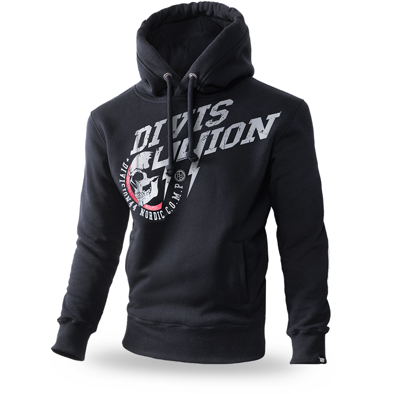 Bluza kangurka wykonana z doskonałej jakości bawełny o masie 320g. Obszerny kaptur z okuciami można regulować za pomocą sznurków. Wewnątrz wszyta duża metka z logo Dobermans Aggressive. Na lewym rękawie mała metka z firmowym logo. Centralnie na piersi umieściliśmy napis DIVISION 44 ustawiony pod kątem. Czwórki ku dołowi przechodzą w błyskawice. Charakteru koszulce dodaje czaszka ustawiona bokiem, otoczona czerwonym półkolem i napisami. Tył gładki z małą grafiką na karku.