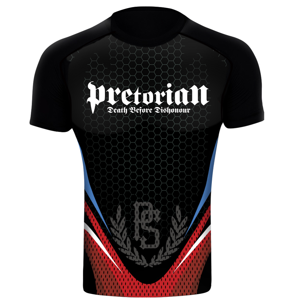 Pretorian Fightwear! Wysokiej jakości rashguard marki Pretorian. Idealna pozycja dla miłośników sportów walki. Rashguard z krótkim rękawem idealnie sprawdzi się podczas walki w stójce oraz walce wielopłaszczyznowej.