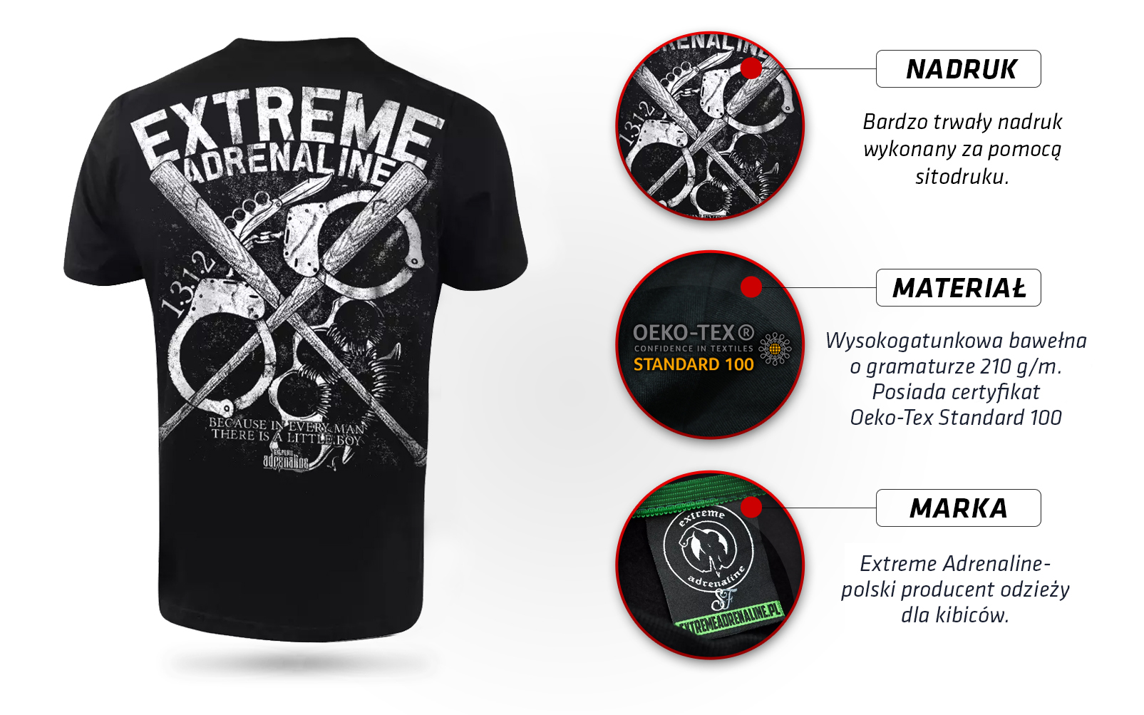 Kibicowska koszulka wykonana przez polskiego producenta odzieży dla kibiców - Extreme Adrenaline. Podczas projektowania oraz wykonania koszulki zadbano o jej najdrobniejsze detale. Nadruk na koszulce wykonany został przy pomocy sitodruku. Jest bardzo trwały i nie ulega zniszczeniu podczas użytkowania. Produkt należy prać w temperaturze nie przekraczającej 40 stopni, pozwoli to zdecydowanie dłużej zachować trałość nadruku.