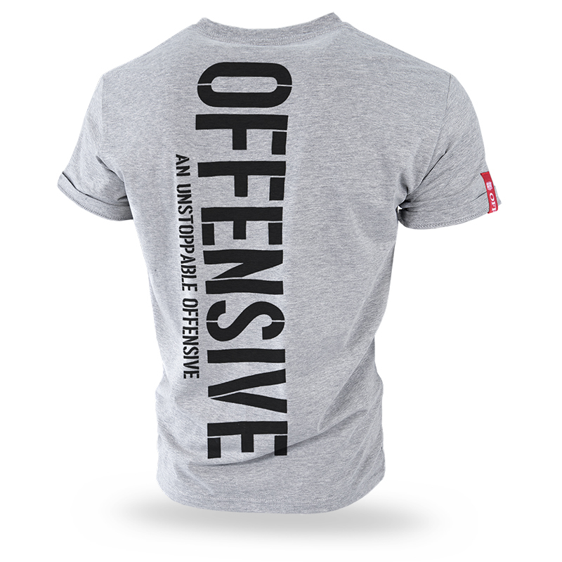 Klasyczna koszulka męska z krótkim rękawem, wykonana ze stuprocentowej bawełny o wysokiej gramaturze. T-shirt z dużym nadrukiem " Offensive An Unstoppable Offensive " na całej linii pleców. T-shirt wykończony szeroką lamówka przy szyi oraz czerwona wszywką przy rękawie z logo marki. Z przodu w linii obojczyka niewielki nadruk z kolekcji Offensive Premium.