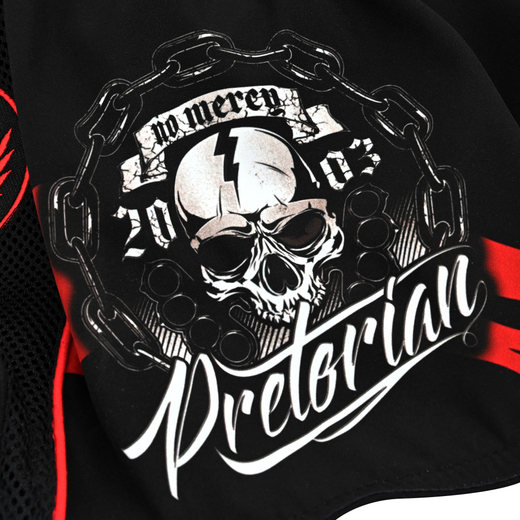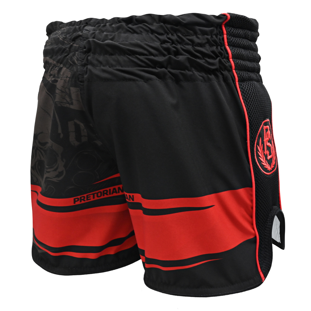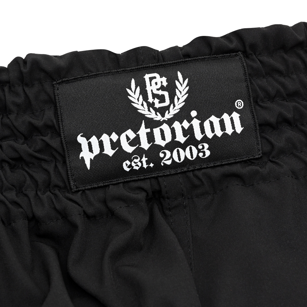 Spodenki posiadają luźny krój oraz dodatkowe rozcięcia na bokach nogawek, zapewniając dzięku temu komfort przy wysokich kopnięciach. Szeroki, elastyczny pas, który doskonale trzyma spodenki na miejscu i nie pozwala im się przemieszczać. Na środku przyozdobiony został naszywką z wizerunkiem logo marki Pretorian. Spodenki są bardzo lekkie - wykonane z lekkiego i elastycznego poliestru z mieszanką elastanu.