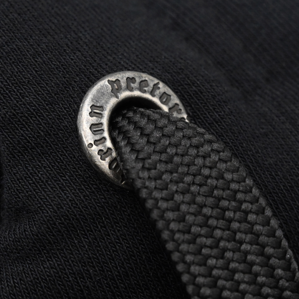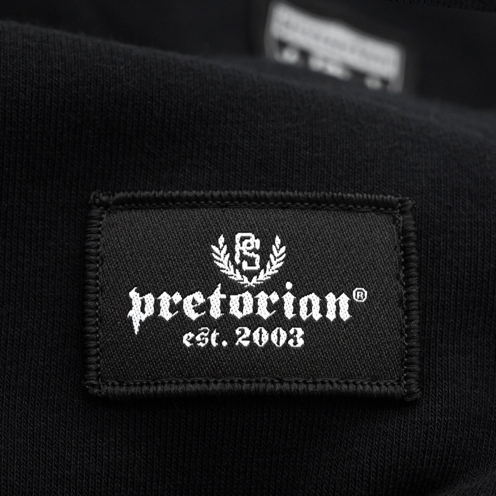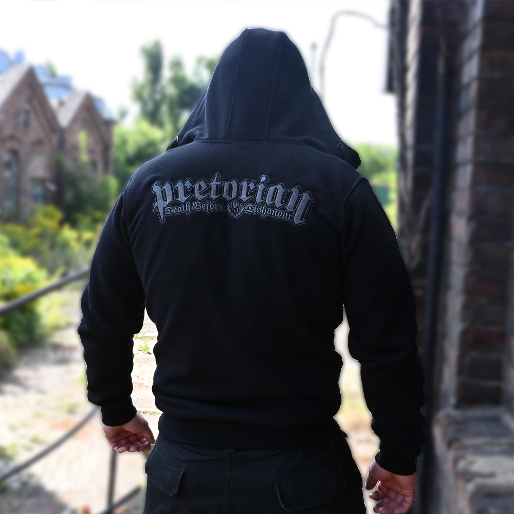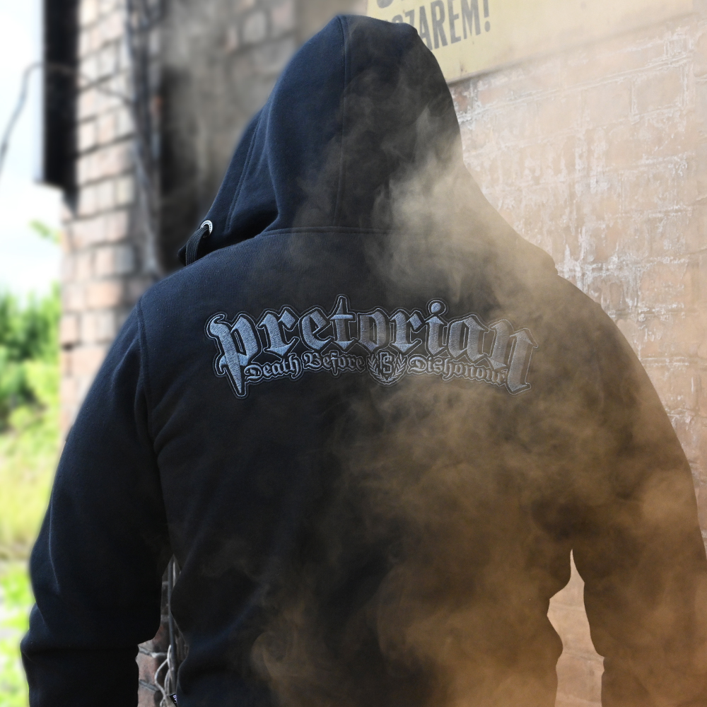 Bluza z kapturem marki Pretorian z solidną aplikacją na plecach. Wysokiej jakości nadruk wykonany w starym stulu dodaje bluzie niebywały charkter. Wykonana w wersji z wyższym kapturem, które zapewnia doskonałą ochronę szyi, posiada dwie kieszenie. Z przodu na piersi dyskretna wszywka materiałowa z wizerunkiem loga marki. Bluza marki Pretorian cechuje najwyższa jakość wykonania oraz dbałość o najdrobniejsze szczegóły i detale.