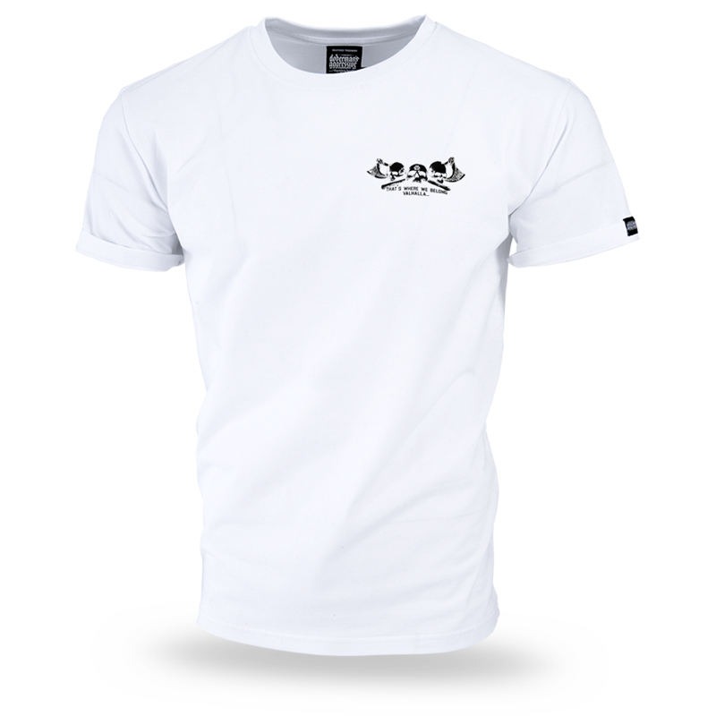 Męska koszulka w standardowym fasonie. Wykonana z bawełny o bardzo wysokiej gramaturze . Na lewym rękawku wszyta mała metka z logo marki. Na plecach dwukolorowa grafika z napisem Viking Comp, trzema czaszkami i toporami oraz napisem „That’s where we belong Valhalla.” Z przodu na lewej piersi, miniaturka grafiki znajdującej się z tyłu koszulki.