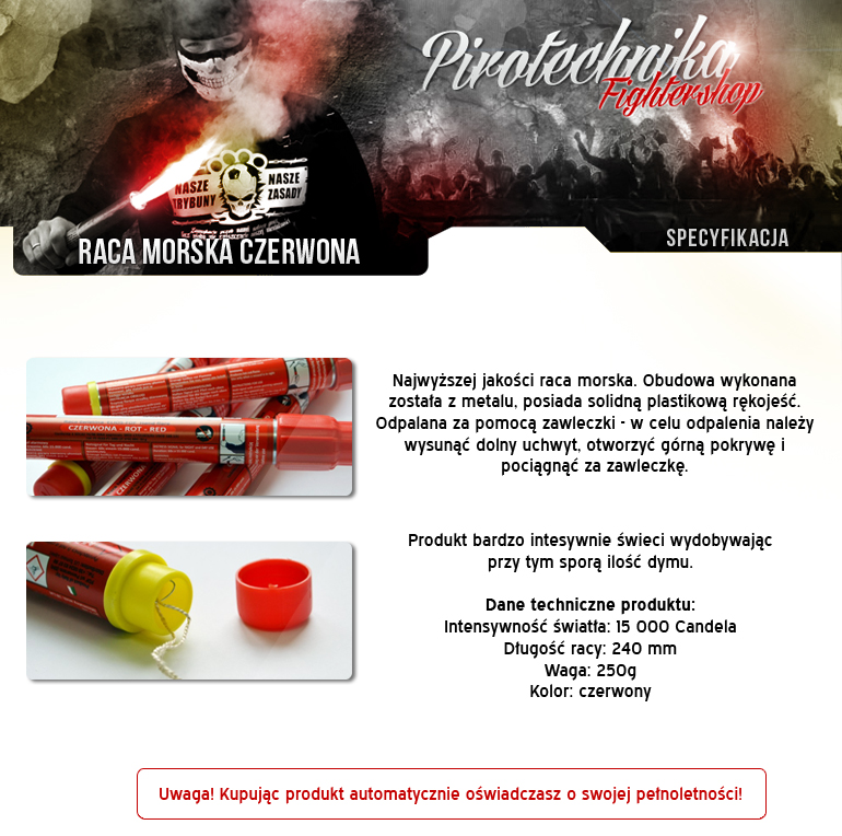 Raca morska Elios to wysokiej jakości flara sygnalizacyjna przeznaczona do zastosowań morskich, ale często wykorzystywana także podczas opraw stadionowych. Charakteryzuje się intensywnym, jaskrawym płomieniem oraz dużą ilością dymu, co zapewnia doskonałą widoczność nawet w trudnych warunkach. Dzięki swojej trwałości i odporności na warunki atmosferyczne jest popularnym wyborem wśród kibiców tworzących widowiskowe efekty wizualne - określana jako raca stadionowa.