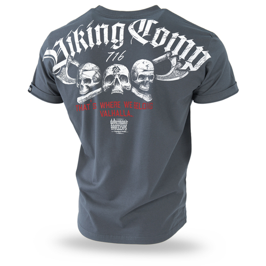 Męska koszulka w standardowym fasonie. Wykonana z bawełny o bardzo wysokiej gramaturze . Na lewym rękawku wszyta mała metka z logo marki. Na plecach dwukolorowa grafika z napisem Viking Comp, trzema czaszkami i toporami oraz napisem „That’s where we belong Valhalla.” Z przodu na lewej piersi, miniaturka grafiki znajdującej się z tyłu koszulki.
