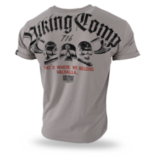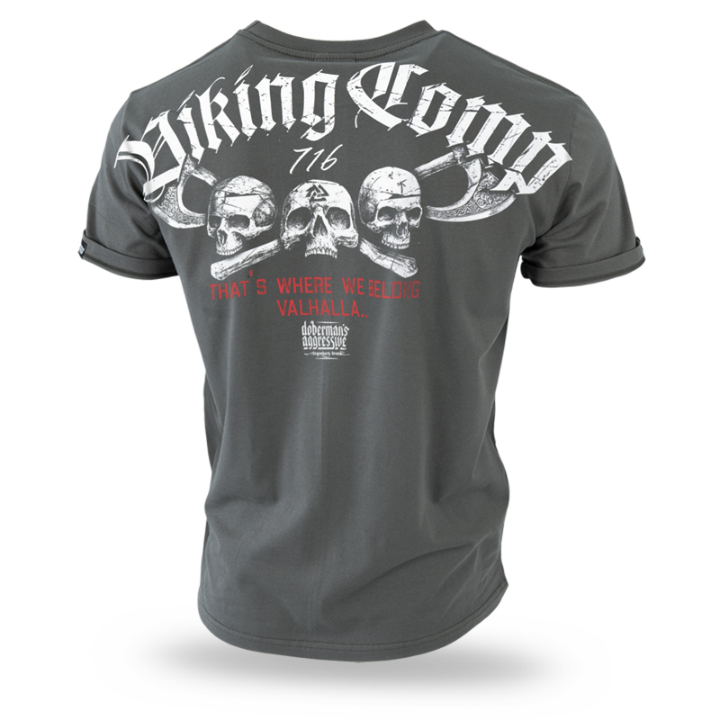 Męska koszulka w standardowym fasonie. Wykonana z bawełny o bardzo wysokiej gramaturze . Na lewym rękawku wszyta mała metka z logo marki. Na plecach dwukolorowa grafika z napisem Viking Comp, trzema czaszkami i toporami oraz napisem „That’s where we belong Valhalla.” Z przodu na lewej piersi, miniaturka grafiki znajdującej się z tyłu koszulki.