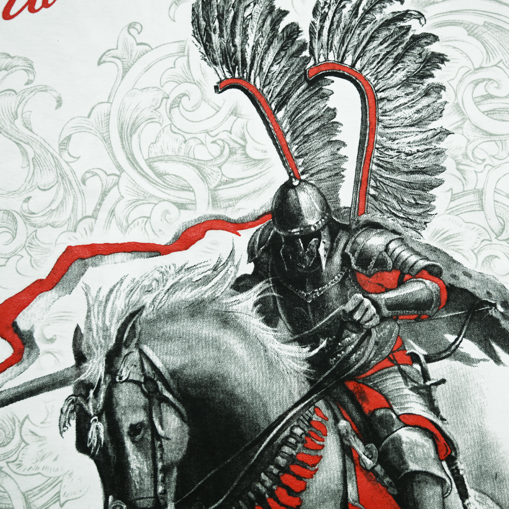 Wyjątkowa koszulka patriotyczna z motywem dumy Wojska Polskiego - Husarii. Wykonana z białej, wysokogatunkowej bawełny przez polskiego producenta odzieży - Aquila. Podczas projektowania oraz wykonania koszulki zadbano o jej najdrobniejsze detale. Nadruk na koszulce wykonany został przy pomocy sitodruku. Jest bardzo trwały i nie ulega zniszczeniu podczas użytkowania. Produkt należy prać w temperaturze nie przekraczającej 40 stopni, pozwoli to zdecydowanie dłużej zachować trałość nadruku.