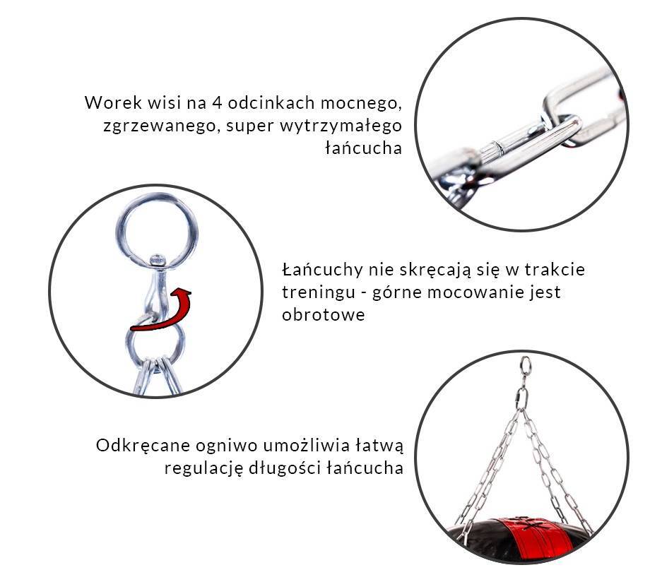 Łańcuchy – zamocowane na okrętce dzięki czemu łańcuchy nie skręcają się podczas gdy worek się rusza. Istotnie łańcuchy są zgrzewane stąd ich niezwykła wytrzymałość. Trójkątne zakończenie łańcuchów- zakończone trójkątami, dzięki czemu taśma nie zwija się i może swobodnie pracować na łańcuchu. Trójkąty sprawiają również, że nacisk na pasy podczas uderzeń rozkłada się równomiernie.