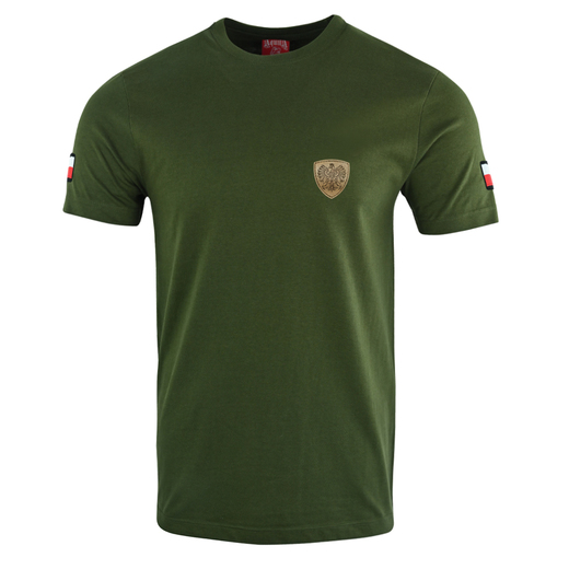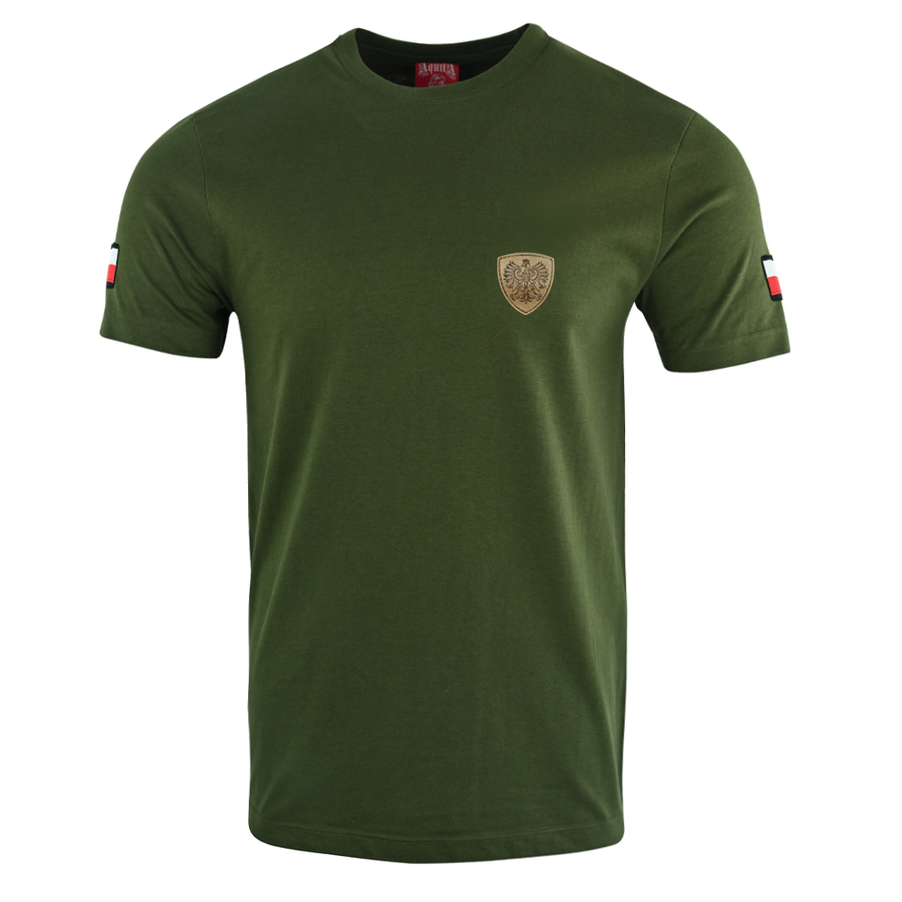 Koszulka patriotyczna marki Aquila z serii dedykowanej wszystkim miłośnikom militarów. Posiada na obu rękawkach haftowane naszywki z wizerunkami Flagi Polski oraz skórkę na sercu z wizerunkiem Orła. Produkt jest bardzo trwały i nie ulega zniszczeniu podczas użytkowania.