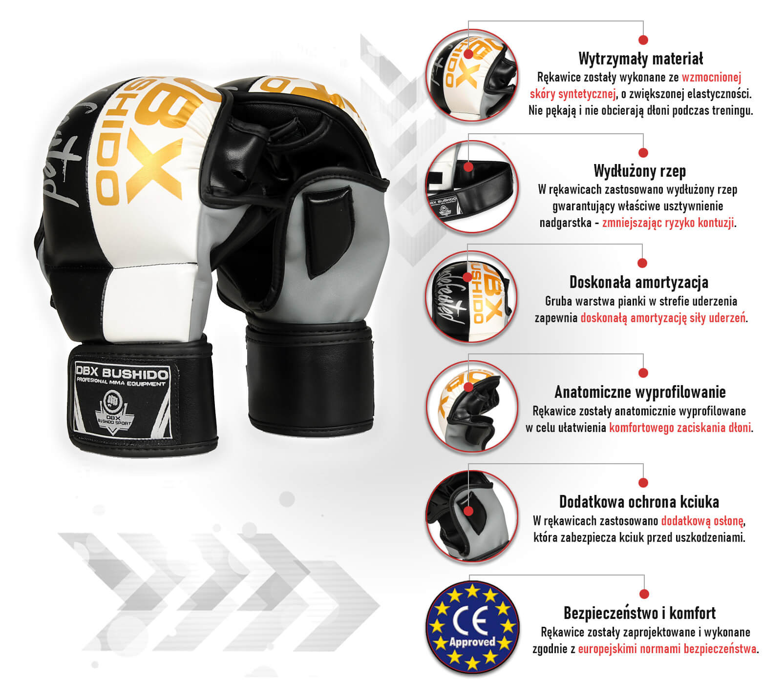 Rękawice MMA ARM-2011b dzięki swojej konstrukcji oraz profesjonalnemu wypełnieniu nadają się do treningu MMA, Krav Magi, Boksu/ Kickboxingu. Odsłonięta wewnętrzna część rękawicy zapewnia możliwości chwytne oraz zapobiega poceniu się dłoni podczas treningu. Rękawice wykonano ze skóry syntetycznej o zwiększonych parametrach wytrzymałościowych, dzięki czemu są trwałe i jednocześnie łatwe w utrzymaniu czystości. Wnętrze rękawicy zostało obszyte gładkim, przyjemnym w dotyku materiałem zapobiegającym obtarciom nawet podczas bardzo intensywnych treningów. W rękawicach zastosowano wydłużony rzep pozwalający na dwukrotne owinięcie nadgarska – gwarantuje to jego właściwe usztywnienie oraz zapobiega kontuzjom. Jedną z najczęściej zdarzających się kontuzji podczas treningu są obtarcia oraz uszkodzenia kciuka. W celu rozwiązania tego problemu w modelu MMA ARM-2011b zastosowano dodatkową osłonę zabezpieczającą kciuk przed uszkodzeniami.
