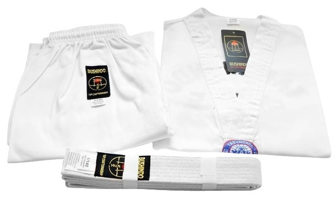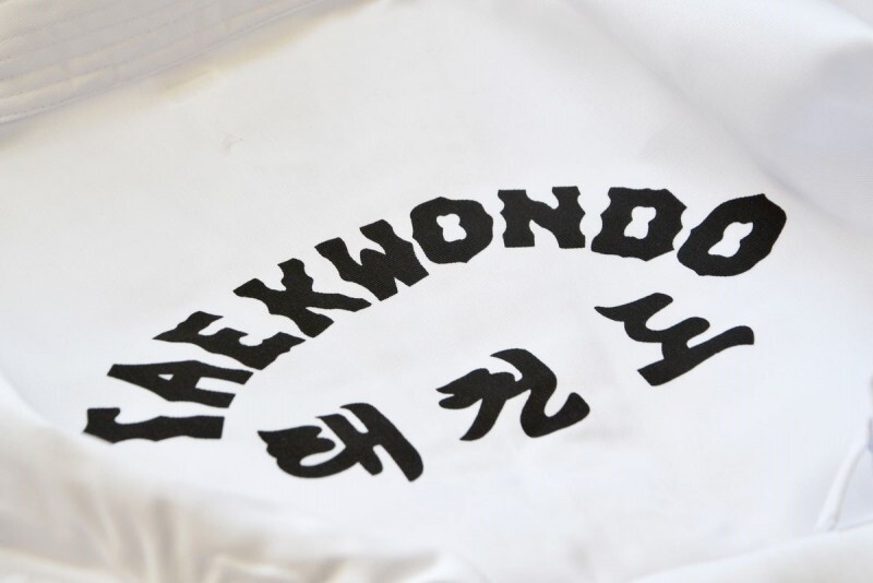 Nadruk „taekwondo” na plecach, tkanina o gładkiej strukturze. Bluza ubierana przez głowę, spodnie ściągane są w pasie gumką z dodatkowym sznurkiem do wiązania umożliwia lepsze dopasowanie rozmiaru.