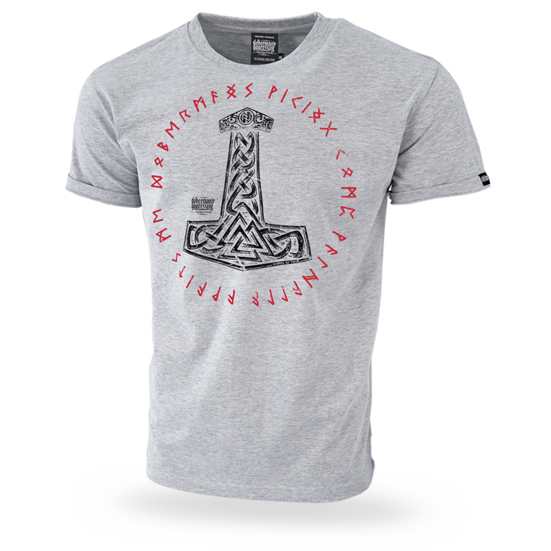 Męska koszulka w standardowym fasonie. Wykonana z wysokiej jakości bawełny. Na lewym rękawku wszyta mała metka z logo marki. Na przodzie grafika przedstawiająca młot Thora i logo marki. Dookoła grafiki czerwone symbole runiczne. Z tyłu na karku, miniaturka grafiki młota Thora.