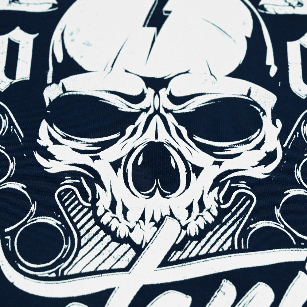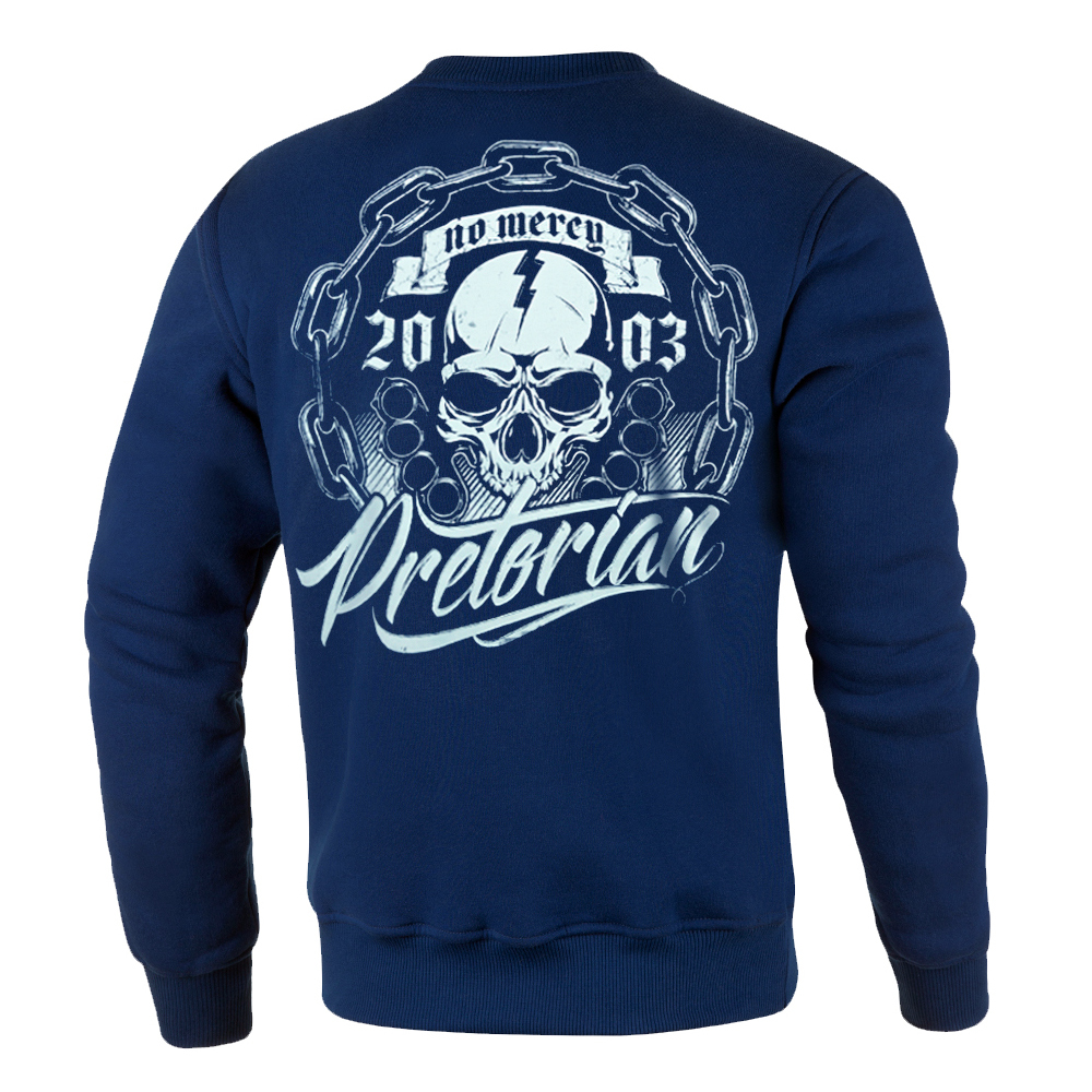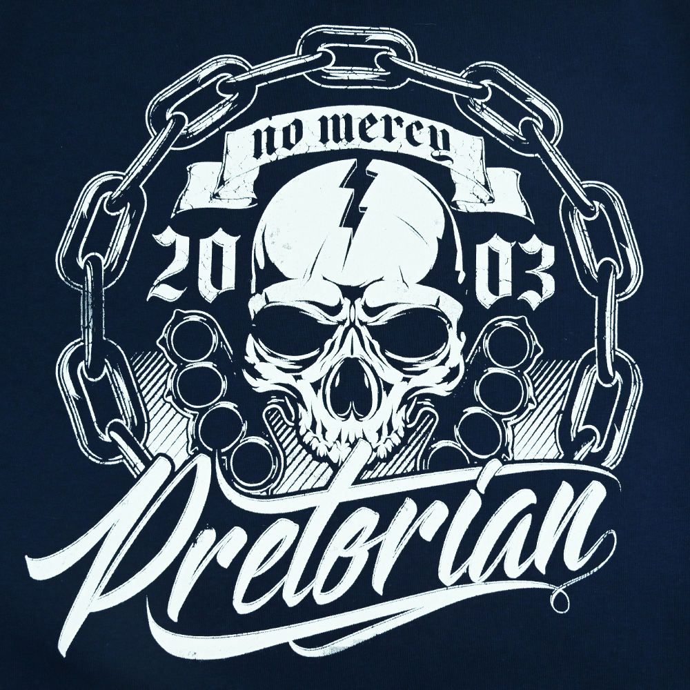 Granatowa klasyczna bluza marki Pretorian z doskonale znanym motywem czaszki z hasłem "No Mercy". Posiada estetyczny i dopracowany, biały nadruk z przodu oraz duży na plecach. Jeden z mocniejszych, bezkompromisowych wzorów. Produkty marki Pretorian cechuje najwyższa jakość wykonania oraz dbałość o najdrobniejsze szczegóły i detale.