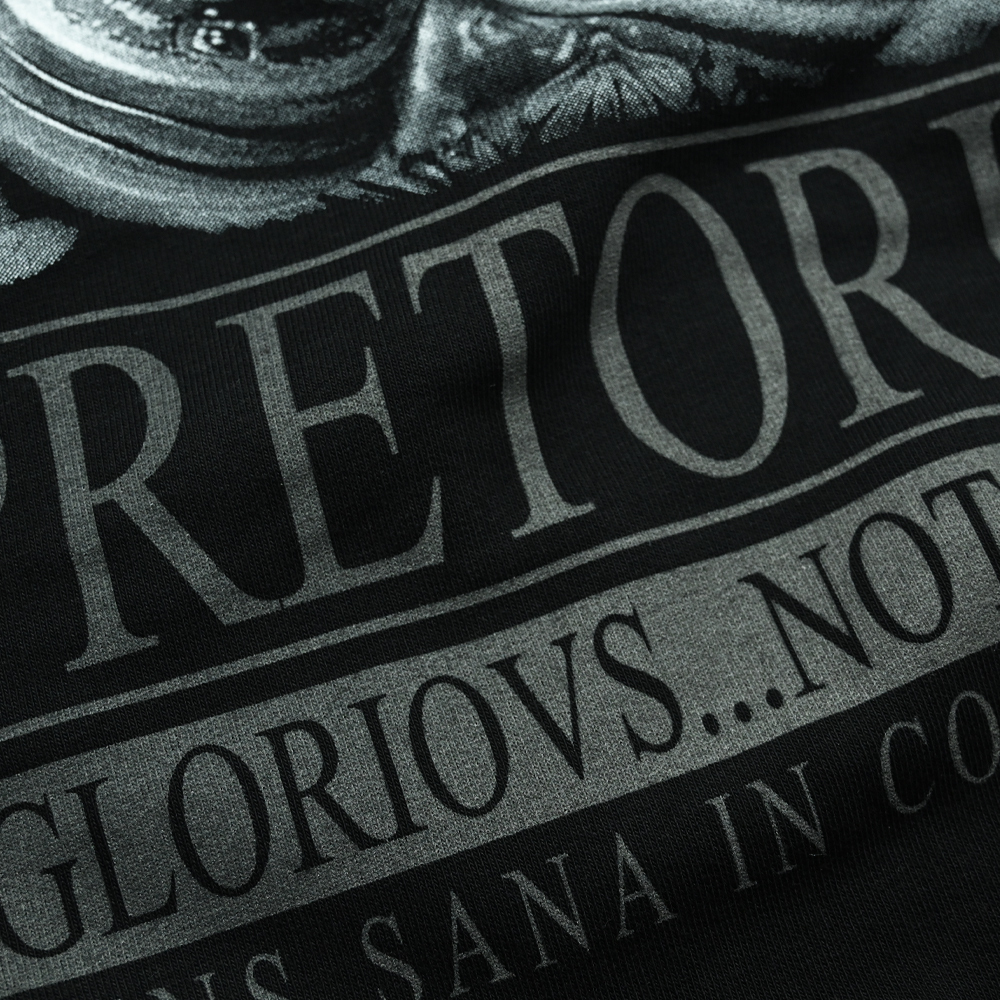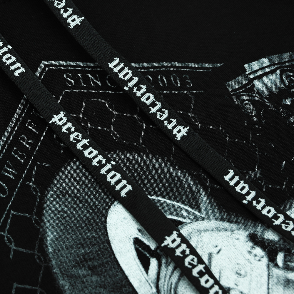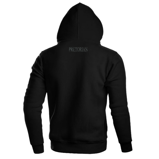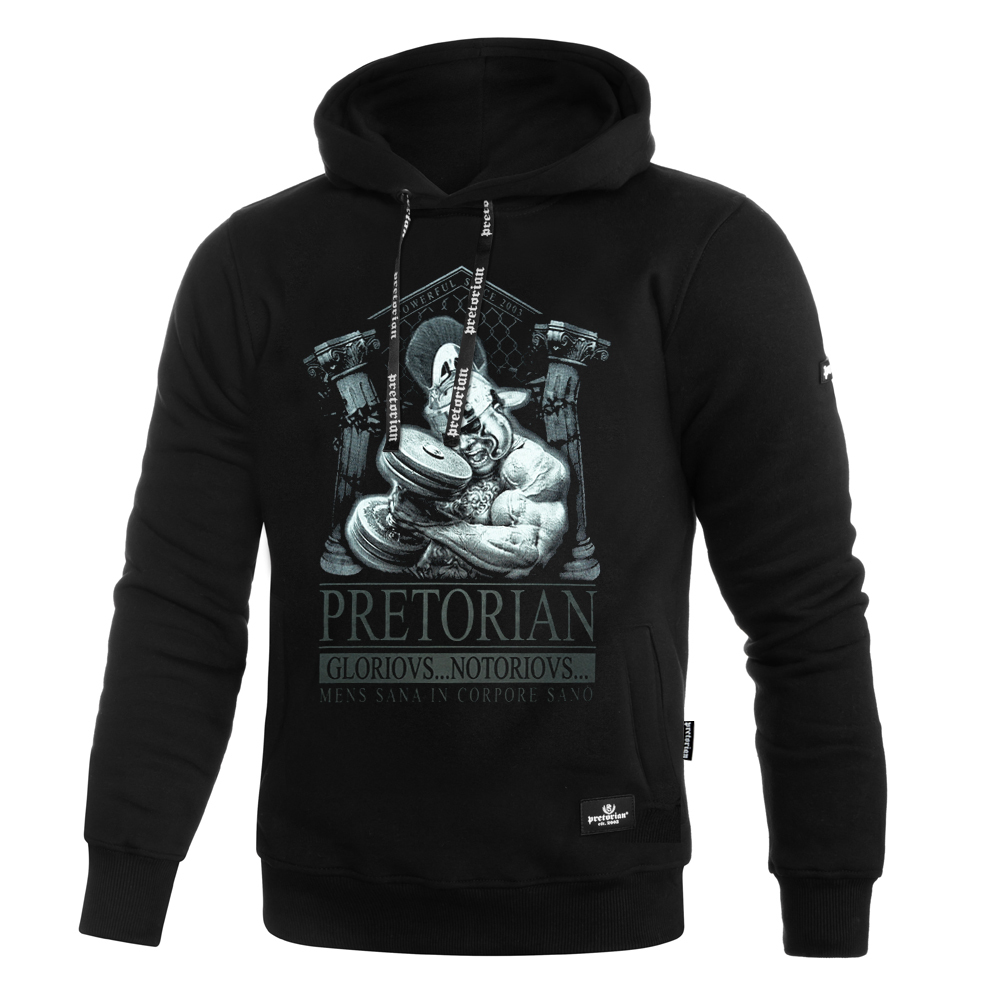 Czarna bluza z kapturem marki Pretorian z estetycznym i dopracowanym nadrukiem. Propozycja dla wszystkich miłośników sportów siłowych. Bluza posiada duży nadruk z przodu oraz niewielki z tyłu na wysokości karku. Produkty marki Pretorian cechuje najwyższa jakość wykonania oraz dbałość o najdrobniejsze szczegóły i detale.