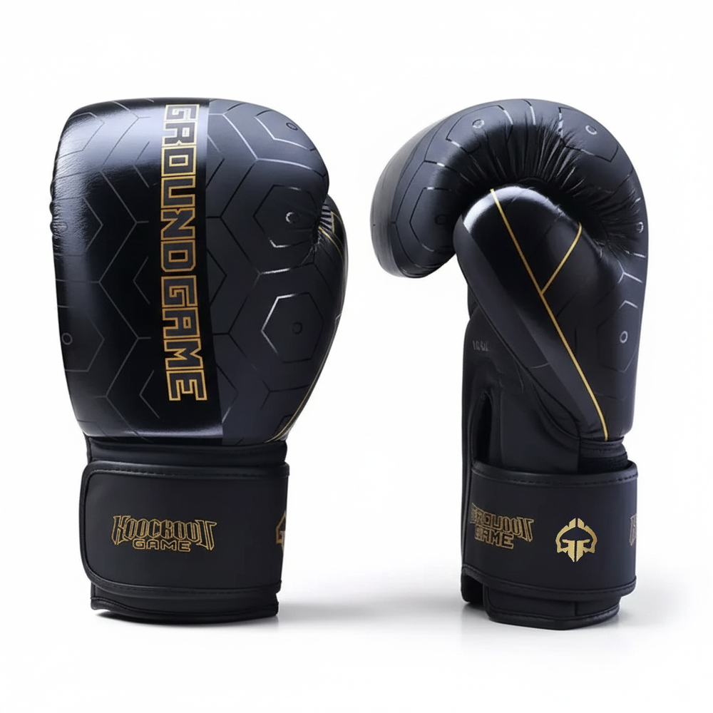 ✅ Rękawice wyróżniają się nowoczesnym, geometrycznym wzornictwem. Czarna, matowa skóra połączona z subtelnymi, połyskującymi heksagonami i złotymi akcentami nadaje im luksusowy charakter. To sprzęt dla zawodników, którzy chcą się wyróżniać. Do kompletu polecamy dobrać profesjonalny ochraniacz na zęby.