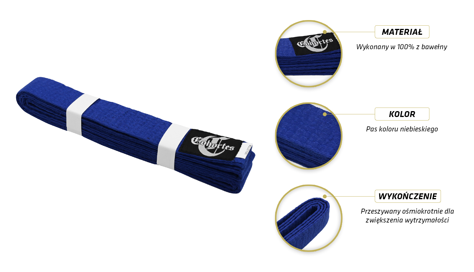 Bawełniany pas do kimona Cohortes o szerokości 4 cm. Przeszywany ośmiokrotnie dla zwiększenia wytrzymałości. Przeznaczony do tradycyjnego podwójnego owinięcia i wiązania. Solidny odporny na uszkodzenia i przetarcia.