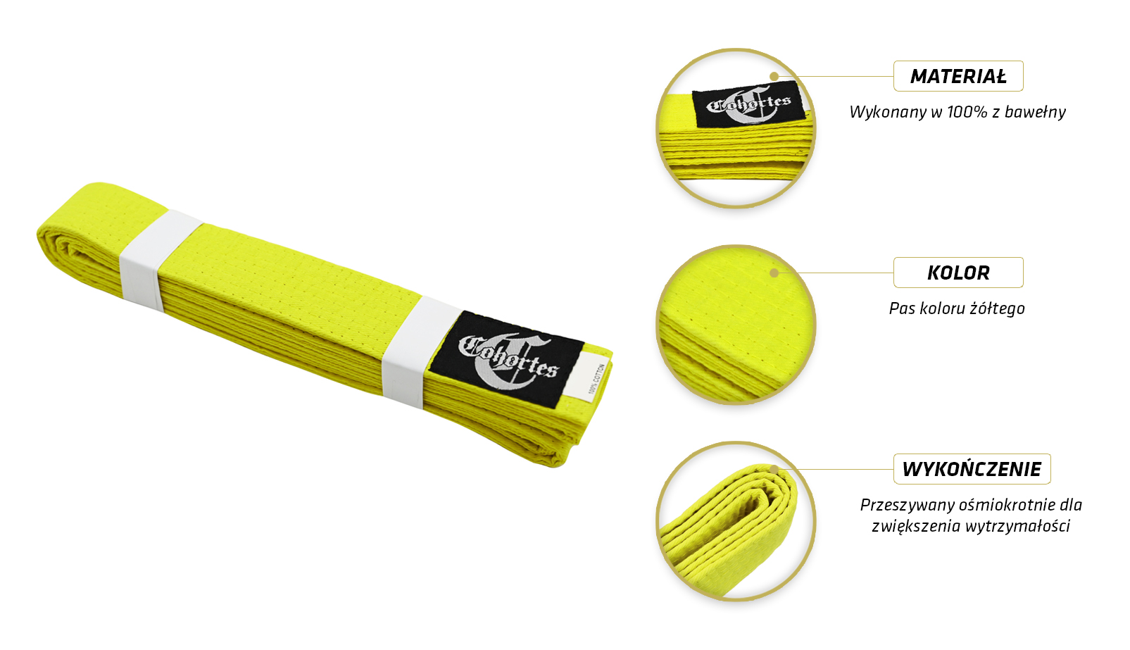 Bawełniany pas do kimona Cohortes o szerokości 4 cm. Przeszywany ośmiokrotnie dla zwiększenia wytrzymałości. Przeznaczony do tradycyjnego podwójnego owinięcia i wiązania. Solidny odporny na uszkodzenia i przetarcia.