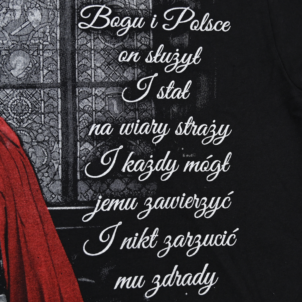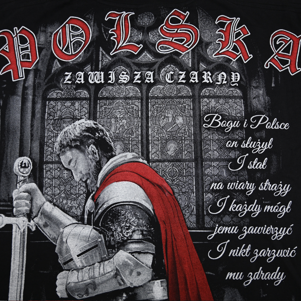 Wyjątkowa koszulka patriotyczna z motywem najsłynniejszego polskiego ryzerza - Zawiszy Czarnego. Wykonana z czarnej, wysokogatunkowej bawełny przez polskiego producenta odzieży - Aquila. Podczas projektowania oraz wykonania koszulki zadbano o jej najdrobniejsze detale. Nadruk na koszulce wykonany został przy pomocy sitodruku. Jest bardzo trwały i nie ulega zniszczeniu podczas użytkowania. Produkt należy prać w temperaturze nie przekraczającej 40 stopni, pozwoli to zdecydowanie dłużej zachować trałość nadruku.