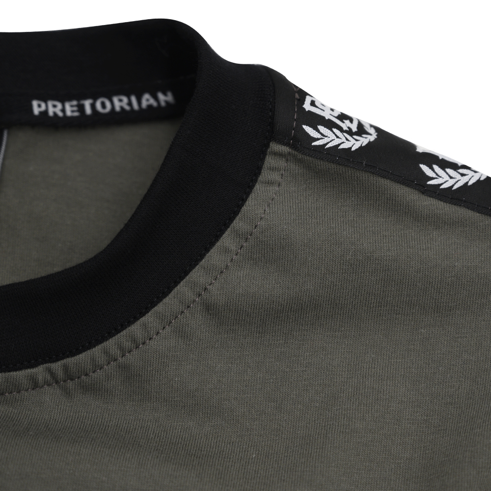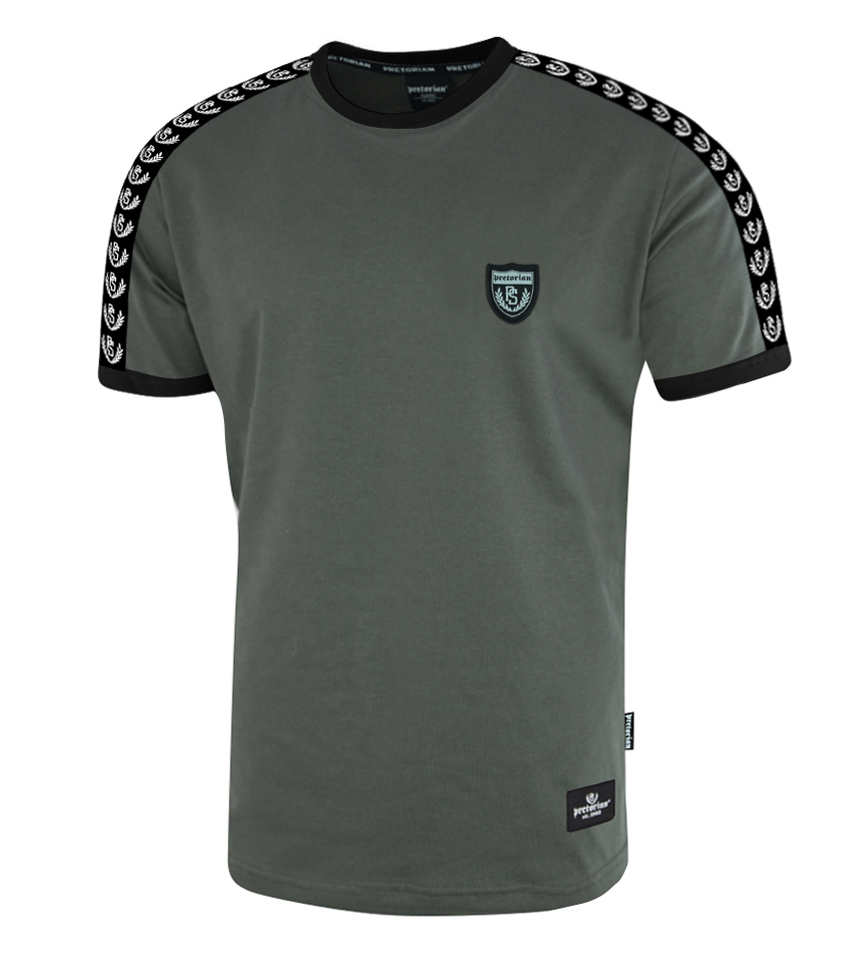 Koszulka marki Pretorian z lampasami na rękawach. Wykonana w kolorze military khaki. Na piersi posiada niewielką materiałową naszywkę z wizerunkiem loga marki Pretorian. Produkt cechuje najwyższa jakość wykonania oraz dbałość o najdrobniejsze szczegóły i detale.