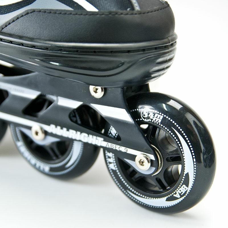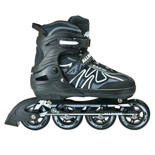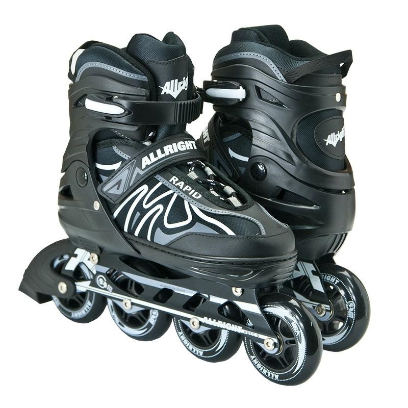 Lekkie, solidne i regulowane rolki marki Allright. To doskonała opcja dla początkujących i bardziej zaawansowanych rolkarzy. Dzięki opcji regulacji rozmiaru możesz idealnie dopasować je do swojej stopy. Warto wziąć to pod uwagę, zwłaszcza gdy stopa użytkownika nie przestała jeszcze rosnąć.Cicho i lekko toczące się kółka PU, wysokiej klasy łożyska ABEC9 Carbon i aluminiowa płoza oraz system wentylacji i wkładka z mikrofibry to dodatkowe atuty wpływające na komfort użytkowania. Wysokiej jakości materiały skorupy zewnętrznej oraz buta wewnętrznego gwarantują wytrzymałość, bezpieczeństwo oraz stabilność produktu.