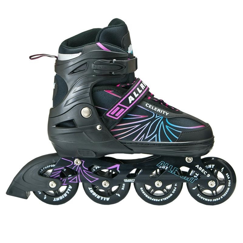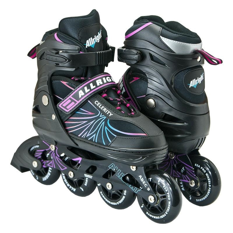 Lekkie, solidne i regulowane rolki marki Allright. To doskonała opcja dla początkujących i bardziej zaawansowanych rolkarzy. Dzięki opcji regulacji rozmiaru możesz idealnie dopasować je do swojej stopy. Warto wziąć to pod uwagę, zwłaszcza gdy stopa użytkownika nie przestała jeszcze rosnąć.Cicho i lekko toczące się kółka PU, wysokiej klasy łożyska ABEC9 Carbon i aluminiowa płoza oraz system wentylacji i wkładka z mikrofibry to dodatkowe atuty wpływające na komfort użytkowania. Wysokiej jakości materiały skorupy zewnętrznej oraz buta wewnętrznego gwarantują wytrzymałość, bezpieczeństwo oraz stabilność produktu.