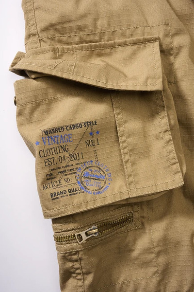 Spodenki wzorowane na krótkiej wersji tradycyjnych spodni M65 Us Army. Zostały wykonane w stylu VINTAGE co oznacza wyglądają na lekko sprane. Styl US Vintage to autentyczna specyfikacja militarna Heavy Duty. Tylne, jak i boczne kieszenie zabezpieczone są patkami zapinanymi na guziki. Dolna część nogawki regulowana jest wszytą taśmą. Obwód pasa można również regulować taśmą ściągającą.