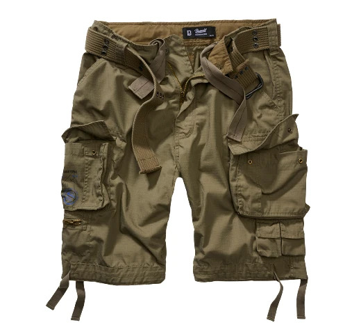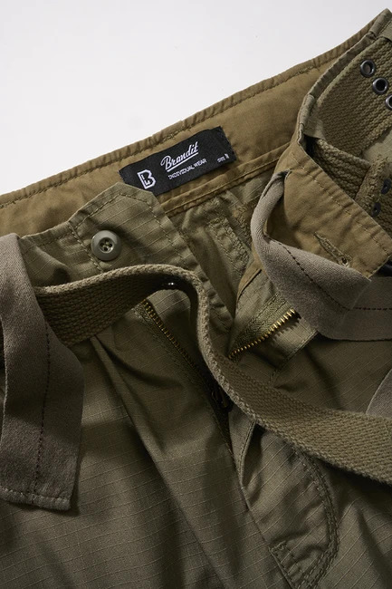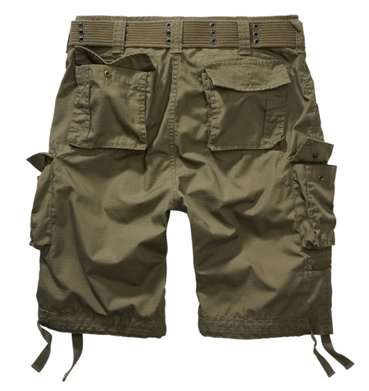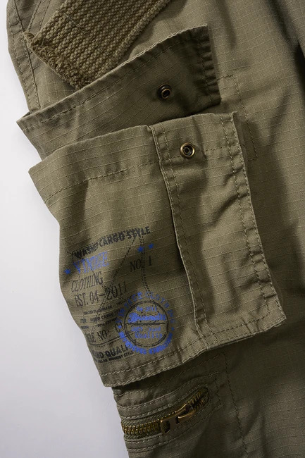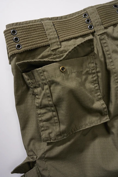 Spodenki wzorowane na krótkiej wersji tradycyjnych spodni M65 Us Army. Zostały wykonane w stylu VINTAGE co oznacza wyglądają na lekko sprane. Styl US Vintage to autentyczna specyfikacja militarna Heavy Duty. Tylne, jak i boczne kieszenie zabezpieczone są patkami zapinanymi na guziki. Dolna część nogawki regulowana jest wszytą taśmą. Obwód pasa można również regulować taśmą ściągającą.