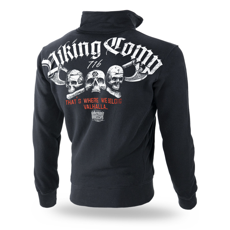 Lewy rękaw z naszytą małą metką Doberman’s Aggressive. Na plecach dwukolorowa grafika z napisem Viking Comp, trzema czaszkami i toporami oraz napisem „That’s where we belong Valhalla”. Z przodu na lewej piersi, miniaturka grafiki znajdującej się z tyłu bluzy.