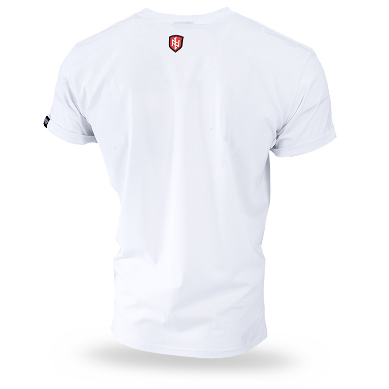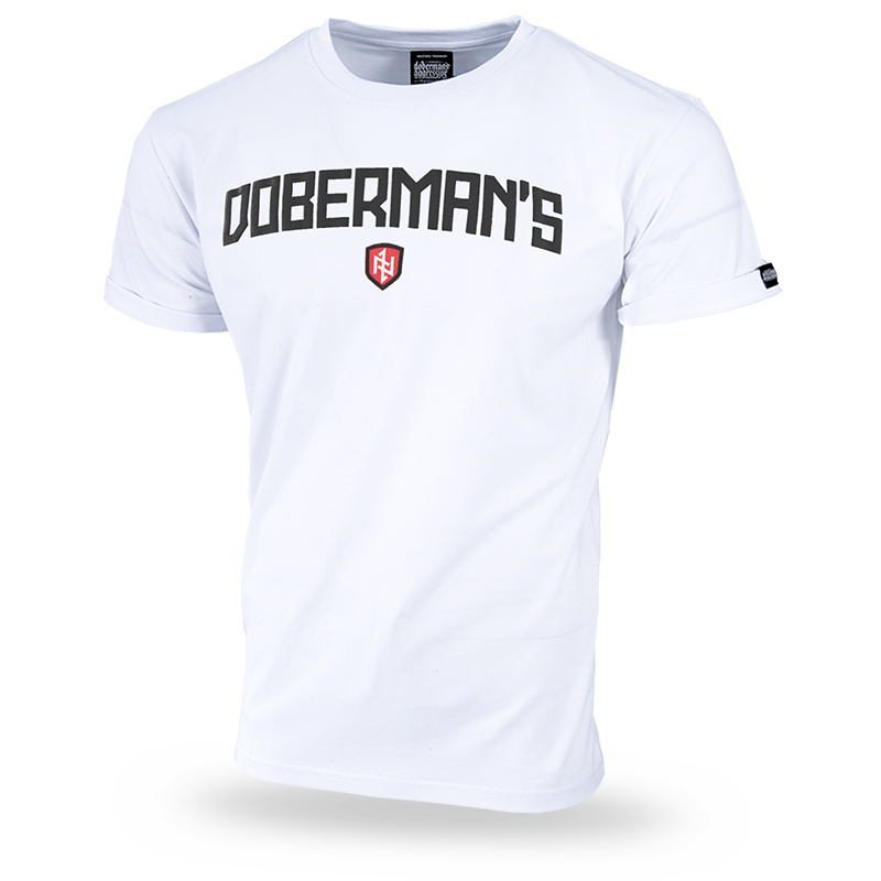 Męski T-shirt o klasycznym kroju wykonany z wysokogatunkowej bawełny. Koszulka posiada krótki rękaw z metką na której jest logo marki. Na przodzie znajduje się duży napis DOBERMAN’S wykonany drukiem wypukłym wraz z haftowaną naszywką tarczy ze znakiem runicznym która znajduje się pod napisem. Na karku znajduję się ta sama naszywka w mniejszym rozmiarze.