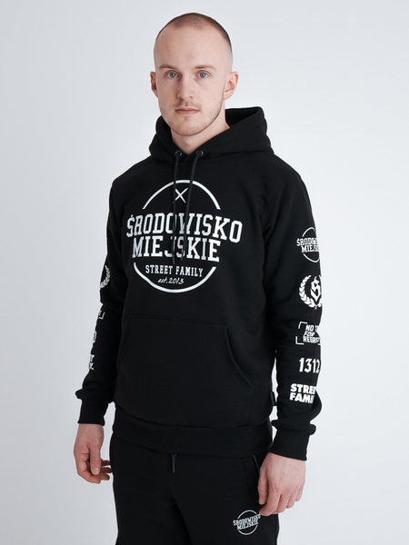 Bluza Środowisko Miejskie z kapturem "Classic mood" - Czarna - Ikona wśród klasyków. Niezwykle miękka i stylowa w swej prostocie bluza. Zachowaj swobodę, niezależnie od okazji. Bluza stworzona została z 100% bawełny wysokiej klasy, dzięki czemu produkt zachowuje swój fason przez cały czas użytkowania. Nadruki wykonane zostały technologią sitodruku, dzięki czemu są bardzo wytrzymałe, a zatem odporne na ścieranie.