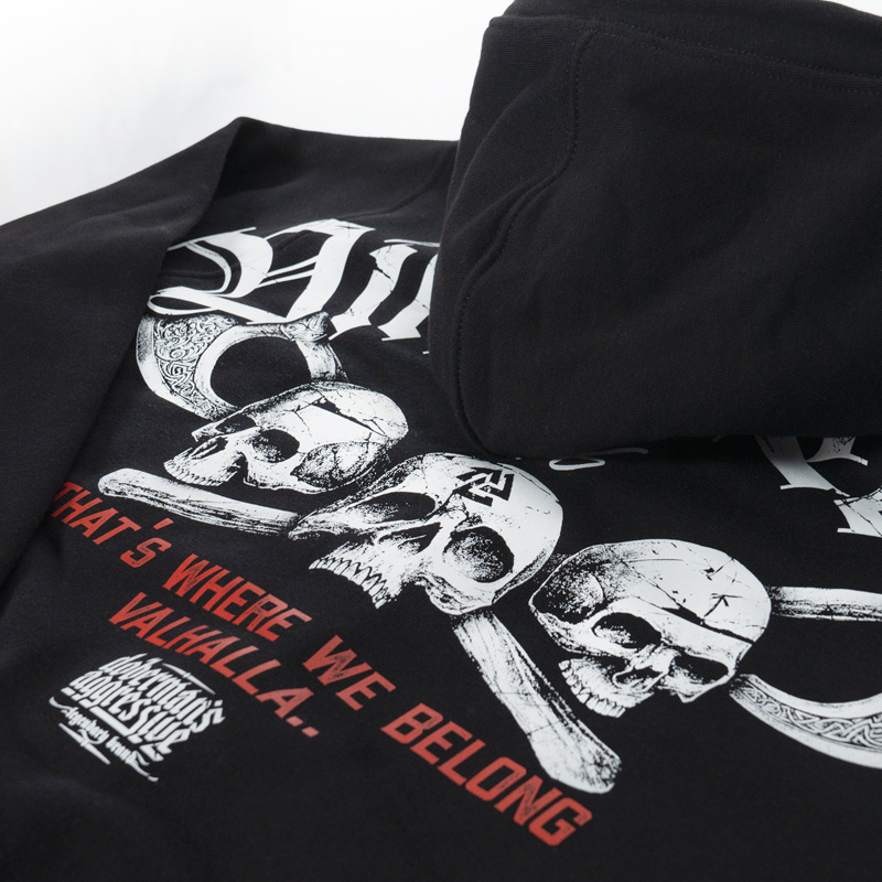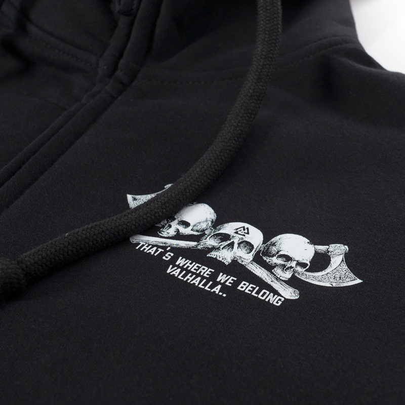 Wykonana z wysokiej jakości bawełny. Na lewym rękawie mała metka z logo marki. Kaptur ozdobiony szerokim sznurkiem oraz okuciami z logo marki. Na plecach dwukolorowa grafika z napisem Viking Comp, trzema czaszkami i toporami oraz napisem „That’s where we belong Valhalla”. Z przodu na lewej piersi, miniaturka grafiki znajdującej się z tyłu bluzy.
